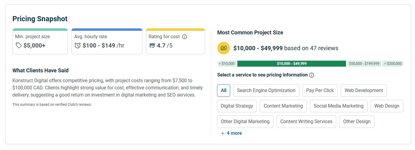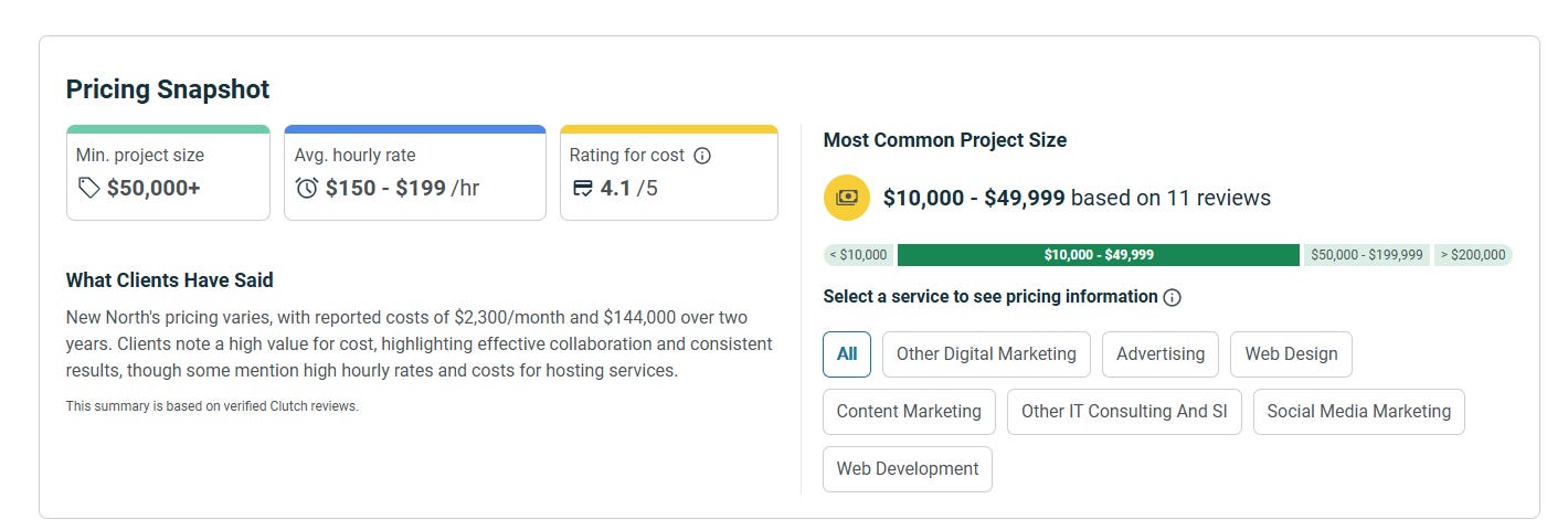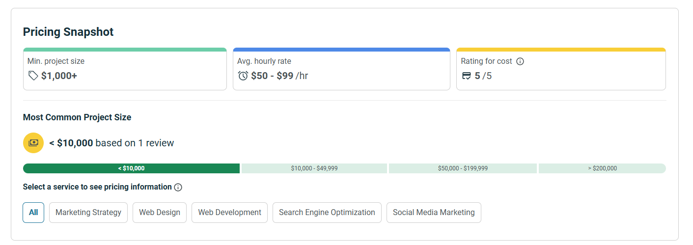 Undisclosed, although the reported average hourly rate sits between $150 - $199/hr with a common project size of $50,000 - $199,999 based on 2 reviews.