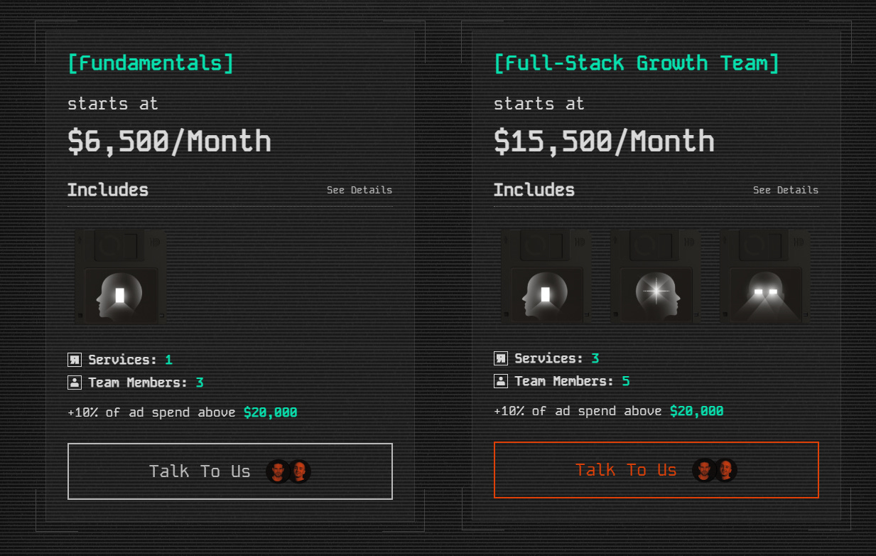 What’s included vs. add-ons, including additional charges for media spend over a certain threshold, dev costs, or content costs if that labor is outsourced.