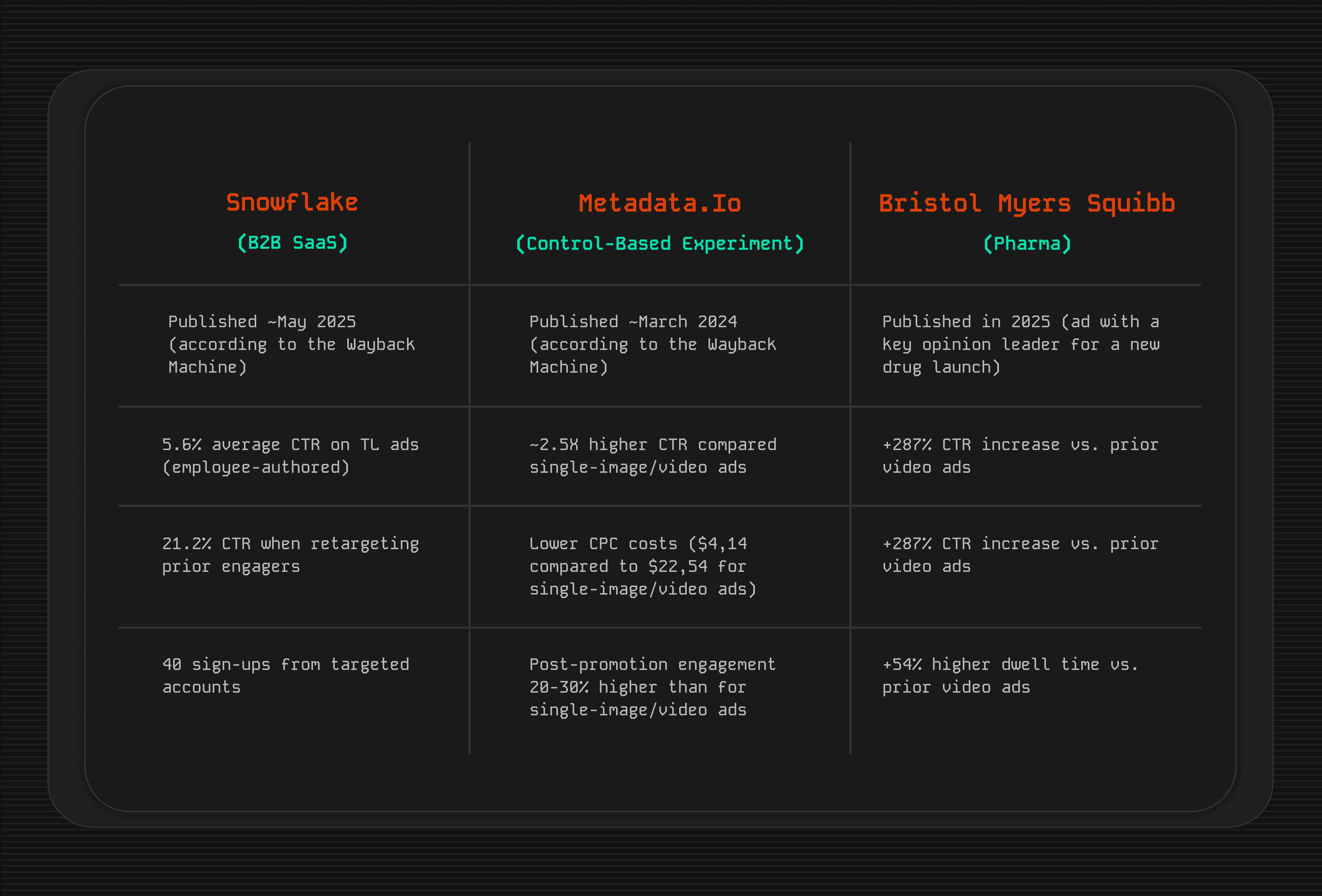 If we compare the CTR in these examples to the average CTR of a single-image ad on LinkedIn (0,47%, according to Huble), it’s clear that TL ads deliver significantly higher performance.